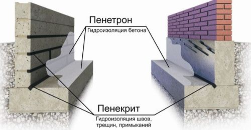 Как видно из схемы на рисунке, модификаторы, входящие в состав смеси, глубоко проникают по капиллярам в тело бетона и там кристаллизуются, надежно запечатывая вход и преграждая дорогу воде. Самые популярные и доступные на сегодняшний день смеси – Пенетрон и Пенекрит, каждый из них используется для покрытия определенных мест, но эффективно работают они только вместе.